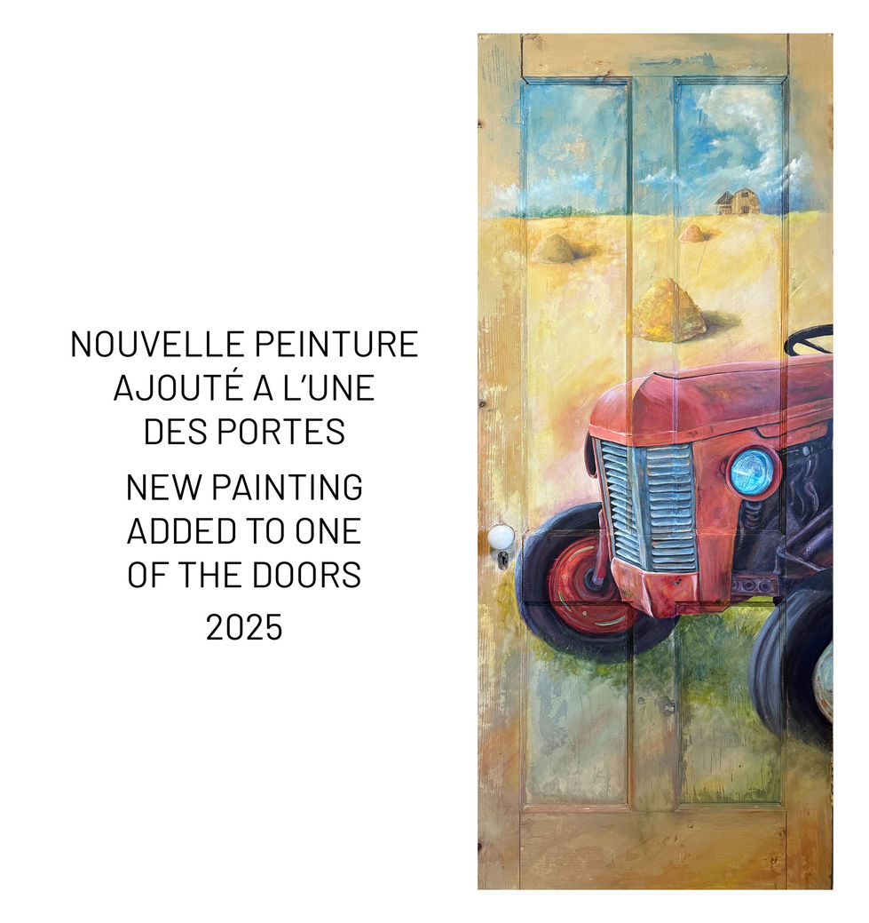 La Conversation ouverte est une représentation de différents aspects de la vie de Joseph Poirier, mon grand-père maternel : son travail, sa contribution à la communauté et sa vie personnelle. N’aillant jamais pas connu mon grand-père, je me suis inspirée de vieilles photos, d’objets personnels et des conversations avec ma mère pour pouvoir mieux interpréter visuellement l’histoire de cet homme. Sur quatre portes antiques provenant de sa région natale, Shediac Bridge, des peintures de style réaliste représentent donc différents objets de son quotidien. L’utilisation de la porte comme support symbolise la conversation ouverte entre mon grand-père et moi-même à travers ce travail artistique. Les portes, parfois ouvertes, mi-ouvertes, à mi-fermées ou fermées, rappellent la maison, la chaleur et la famille. Les arrière-plans sont ponctués d’imperfection par l’esthétique des vieilles portes usées par les intempéries pour rappeler que la mémoire est tout autant ponctuées d’imperfections. L’ensemble des portes est accompagné de petits montages d'objets et de photographies aux murs qui font un rappel de Joseph. En somme, cette pièce est ma version d’un album de souvenir.